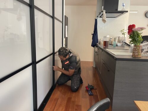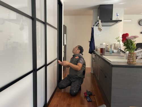 カップボードの扉の調整中です。アフター点検時に直ぐに直せる箇所は対応しています。