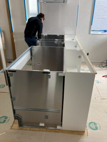 本体と背面収納が背中合わせでガッチャンこしてます。ショールームやモデルハウスで実物はよく目にしますが、仕上がったキッチンがドカーンと運ばれるのではなく、一つ一つ組み合わせて造っていくんです。