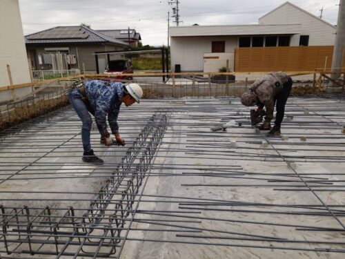 配筋工事。基礎の強度を確保するために鉄筋を組み立てます。組み終わり後、配筋ピッチやかぶり厚さなど設計監理者や第三者機関検査でしっかり検査が入ります。