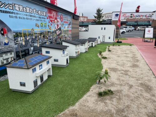 これ、全部模型なのですが、一番手前の寄棟屋根のソーラーは、良くない見本として設置されてて、これもわかりやすいですね。寄棟に太陽光パネルが載っている光景、たまに見ますがイシンホームの南向きに片流れ屋根上に載る太陽光との発電量の違いなどもここで説明できるのは、いいですね。