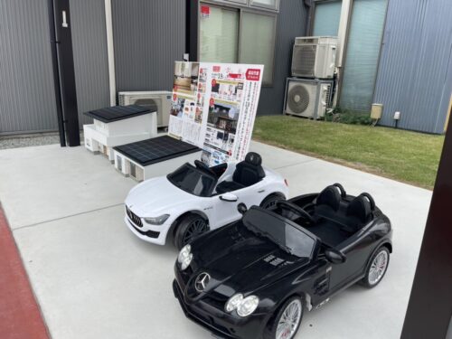 ソーラーポートの展示用のところには、お子様用の電気自動車が設置されてて、EV自動車の充電のことまで子供にわかりやすいように設営されてて、驚きです!!