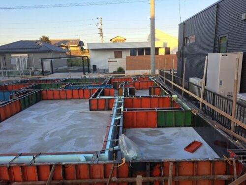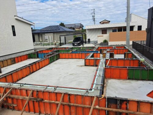 ほぼ、同じ場所からの撮影なのでわかりやすいです。型枠内の水色の断熱材、基礎の立ち上がりの断熱材です。この時点で施工することにより、より一層基礎断熱の効果が強まります。コンクリートが固まって型枠を外すとしっかりと基礎に密着していることがわかります。