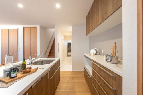 木目調のキッチンやカップボードは、年代限らず馴染みやすい優しい印象ですね。