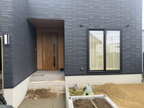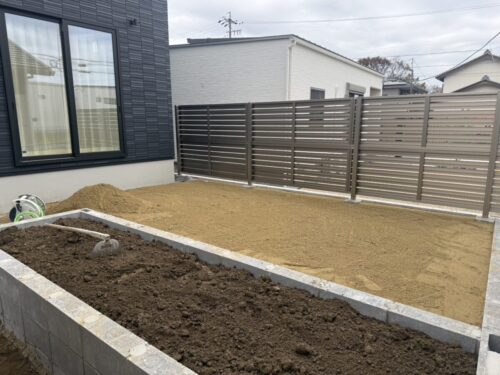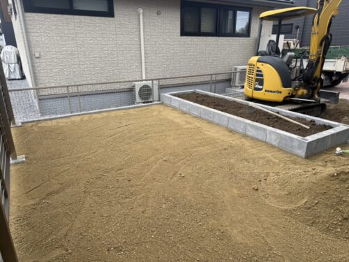 I様邸では、外構工事業者さん作業中です。お庭や花壇の工事が進みました。