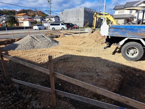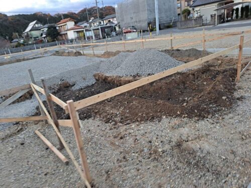 基礎工事は年末年始にかけて進む予定です。基礎工事はお天気に左右されやすいので年内にどこまで工事が進むか、お天気予報とニラメッコが当分の間、続きそう!!