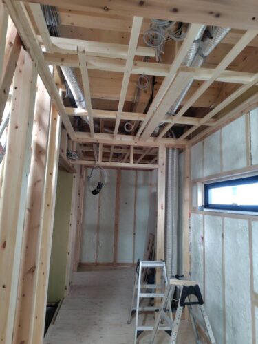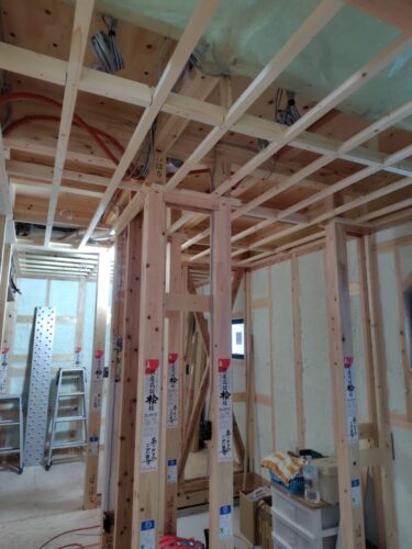 天井下地施工は、重量のある照明器具を設置したい場合や物干し金物の取付箇所などは特に下地強化が必要になるため、要注意です。事前に打合せした内容を大工さんと共有し施工。