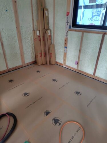 こちらは床貼り後の写真。床貼りした後は、傷がつかないようにしっかりと養生します。