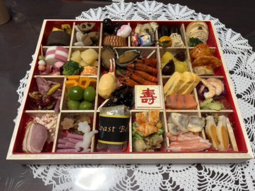 義理母が準備してくれた「お節料理」ネットで注文したと言っていますが、とても豪華で美味しいお節料理でした。三段重でない一段重は珍しいですね。