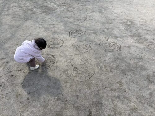 誰かが描いた「アンパンマン」キャラクターのところで、一番小さい孫(1歳)が遊んでいます。何も見ずに描いたのでは?と思いますが、上手に描かれてあり、感激!