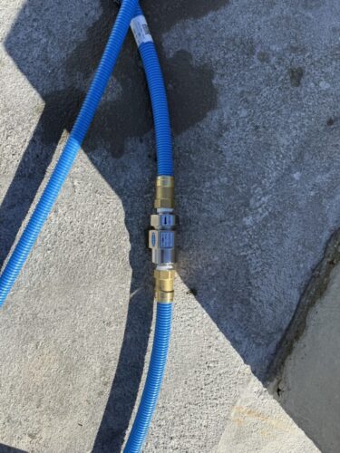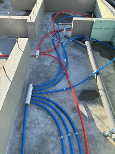 ヘッダー配管と繋がっている塩ビ管の青色は「給水」赤色は「給湯」です。