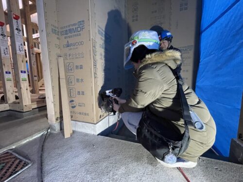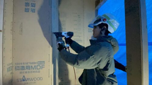 夕方、夕の儀前に、白アリガードマン(面材)のビス打ち体験です。ビスが飛び出す勢いで身体も僅かに後退りするほど!
