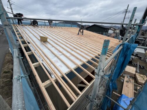 雪がチラつく中、大工さん達は脚元に気をつけながらの作業を進めます。