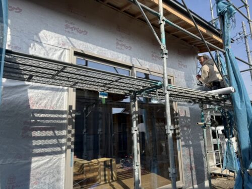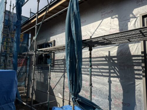 岐阜市のT様邸。外壁下地のタイベックの施工中です。吹き付け断熱と反射断熱シートを併用するので、従来の家に比べて約2.4倍の断熱性能がある外壁下地です😀