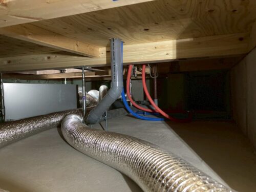 上棟前に大工さんが土台敷する時、上棟後に床材の下の合板を貼る時、しっかりお掃除しますが、どうしてもエコアイの排気ダクト施工の為、床に穴あけした箇所や、給気の穴あけした箇所周辺は、木くずが落ちます。ですので、建物完成時には最後の床下掃除を行います。