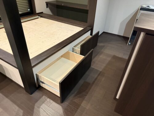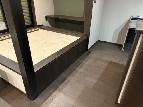 加茂郡坂祝町のT様邸では、小上がりタタミコーナーに造作の引出しが取り付けられました。