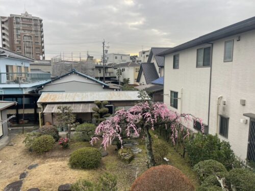 お隣の素敵なお庭に毎年咲く「しだれ梅」は、ホッと一息つく時、心の癒しになります![]()